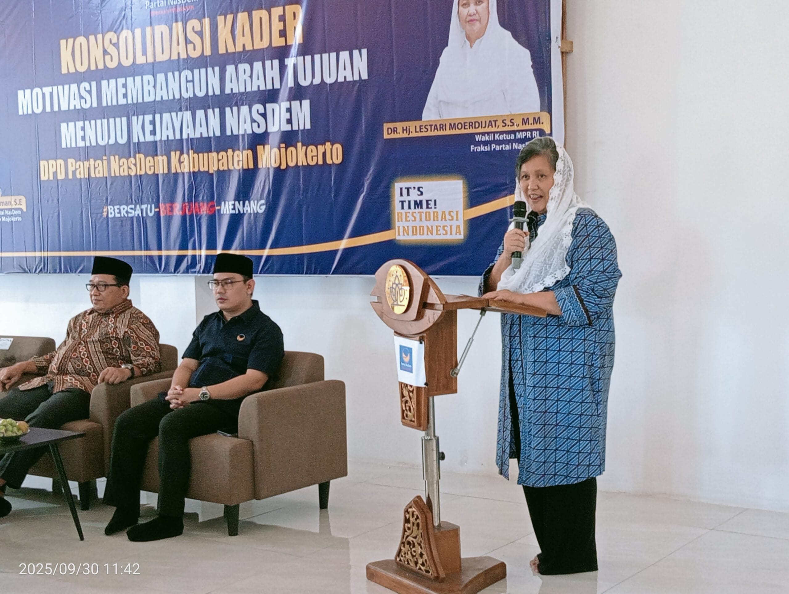 Lestari Moerdijat, mengajak seluruh kader Partai NasDem untuk semakin mendekati masyarakat di tengah kondisi geopolitik global yang tidak menentu.Dalam kunjungannya,Ia didampingi Ketua DPW Nasdem Jawa Timur, Lita Machfud Arifin dan kader Nasdem Jatim Sunyoto, Ketua DPD NasDem Kabupaten Mojokerto, Habiburrohman serta Anggota DPRD Nasdem Kabupaten dan Kota Mojokerto dan anggota DPRD Provinsi H.Suwandy Firdaus.