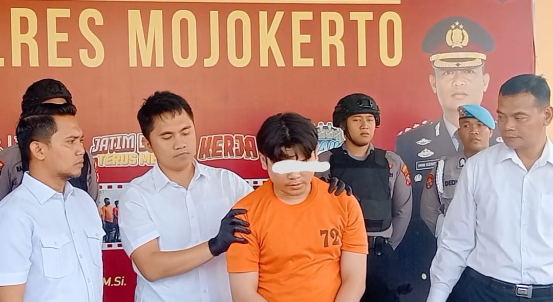 Tersangka AM saat pers rilis di Mako Polres Mojokero (Ft :Susilo/pojokkampungnews.com)