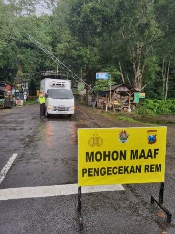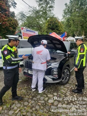 Tampak Petugas Satlantas Polres Mojokerto bersama Mekanik Honda Cek Kondisi Rem Pemotor Res area Jalur Sendi-Pacet(Susilo/pojokkampungnews.com)